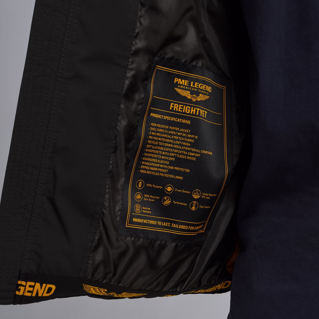 De PME Legend Freightyet is een lichtgewicht, waterafstotende pufferjas. De comfort stretch en Tech Down vulling zorgen voor veel draagcomfort. De elastische heupboord en cuffs houden de kou buiten. De jas is voorzien van twee ruime zijzakken met fleece voering en een rits en een binnenzak met rits. De authentieke flight tapes op de schouders en bij de armsgaten zorgen voor de stoere PME Legend look.