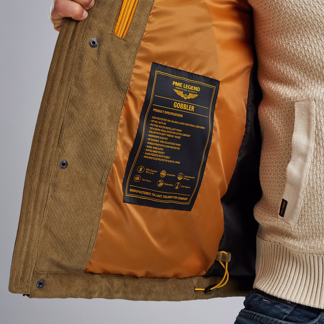 De PME Legend Gobbler is gemaakt van functioneel, waterafstotend corduroy. Het materiaal maakt deze jas bijzonder en zorgt voor een stoere look. De afneembare en verstelbare capuchon biedt flexibiliteit en bescherming in alle weersomstandigheden. Ook de cuffs en heupboord zijn verstelbaar. De voering is voorzien van een authentiek quiltpatroon. Een binnenzak met rits, twee zijzakken met fleece voering en een zak op de mouw bieden veel opbergruimte.